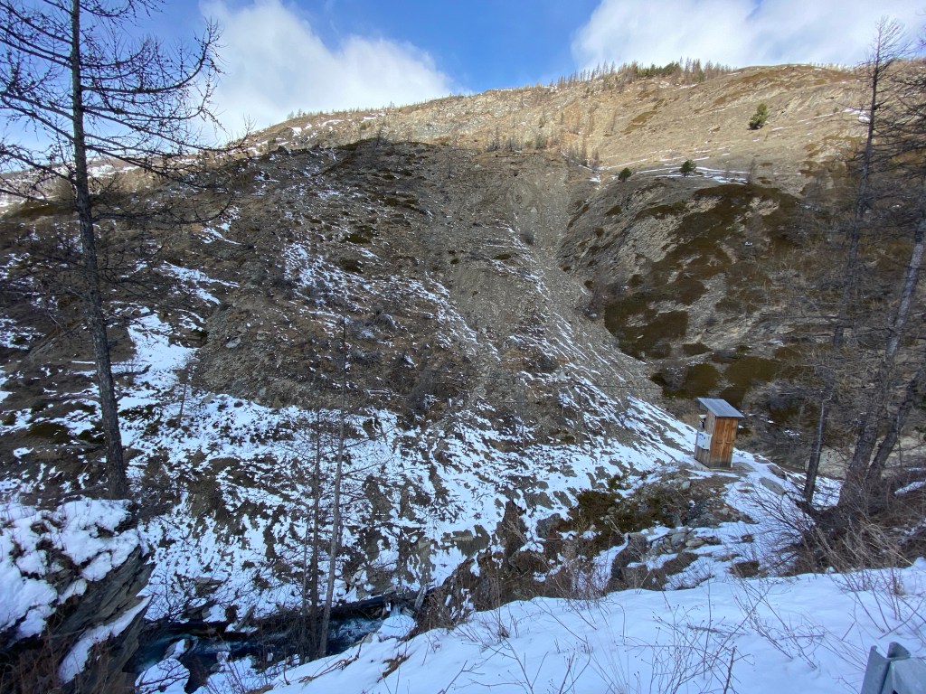 🇬🇧On the way we ‘pay a visit’ to the Pas de l’Ours landslide. Since two years it has progressively cut the only road between the high Guil valley ( and the villages of Abries and Ristolas) to the lower Guil valley and the village of Aiguilles. A new road has been built on the other side of the valley but the landslide still threatens to create a river dam and dangerous upstream and downstream flooding conditions .