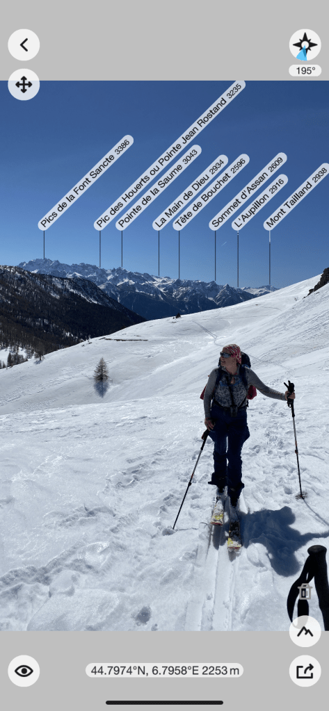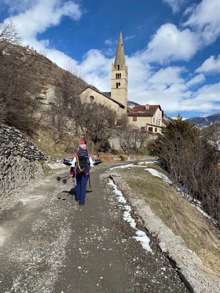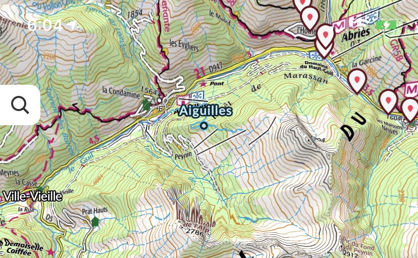 🇬🇧We decide to go to les Fonts de Cervières through the col de Peas ( 2629 m) instead of col Malrif ( more direct ) due to the avalanche risk. This detour also allows us to go through the city of Aiguilles and its doctor’s office in order to check out some pains Claire has in her calf .