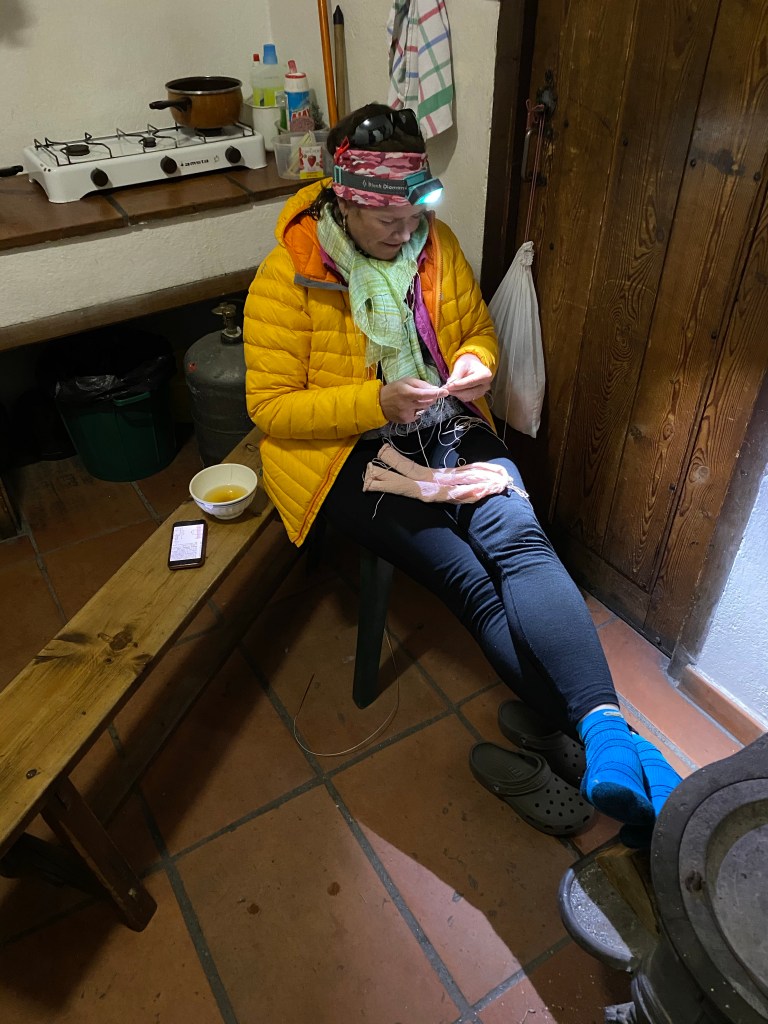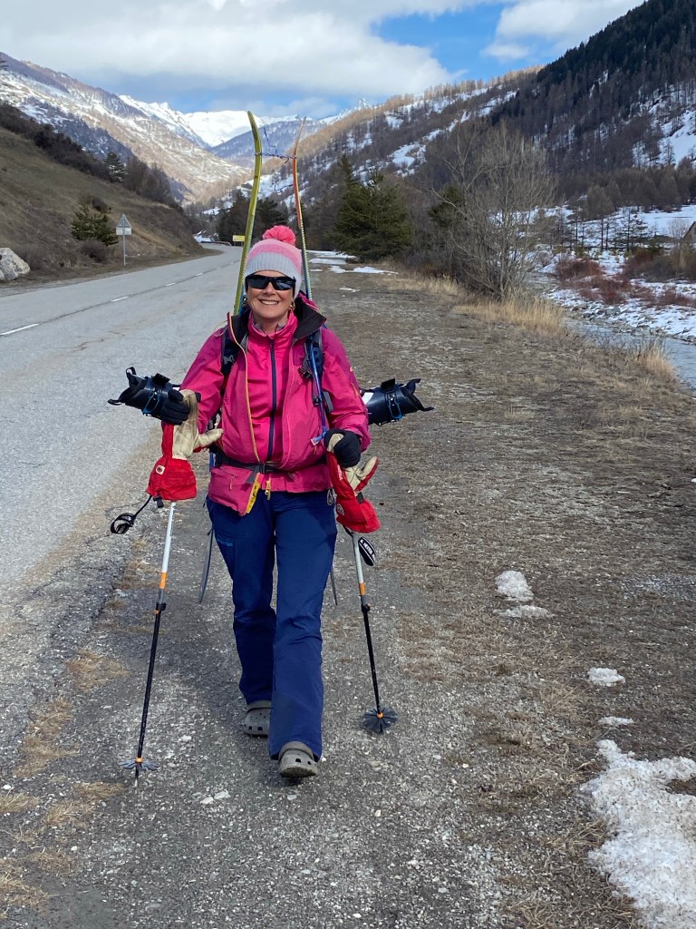 🇬🇧Arrival in Aiguilles . Very nice lunch break. The doctor who checks Claire is a huge ski touring fun and plans to do the Great Alps crossing next year . Claire has a small tendinitis but should be able to continue …we also go to the pharmacy to pick up a few médecine .