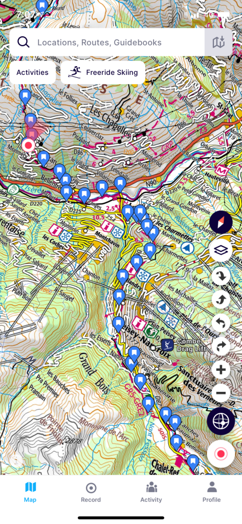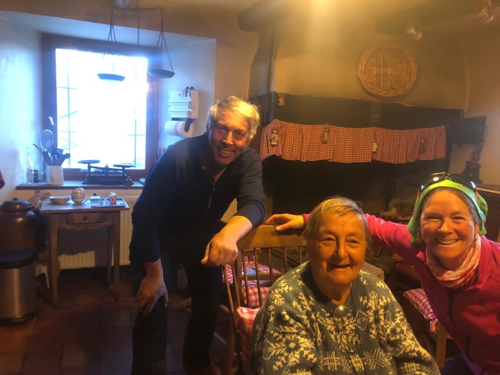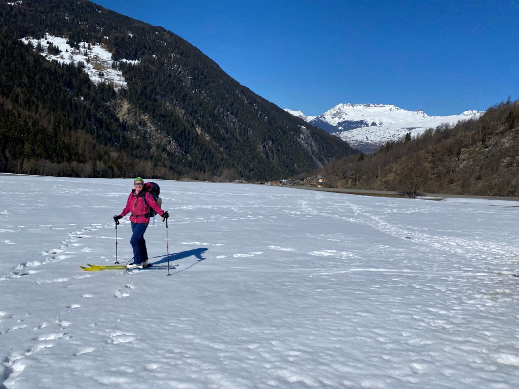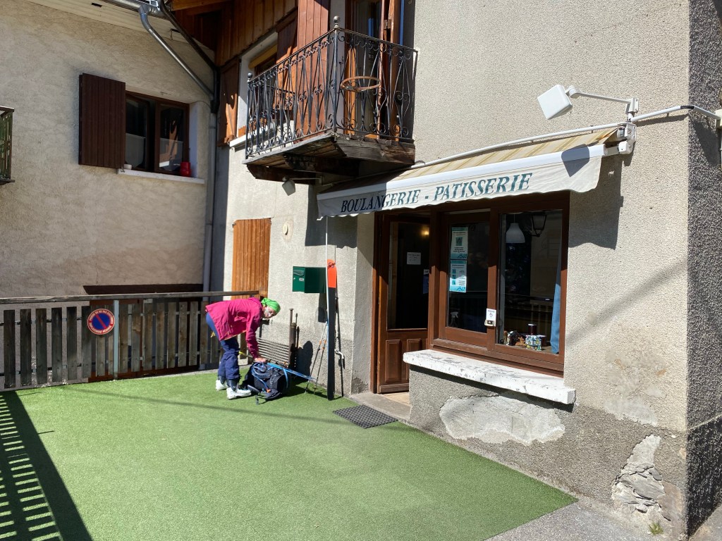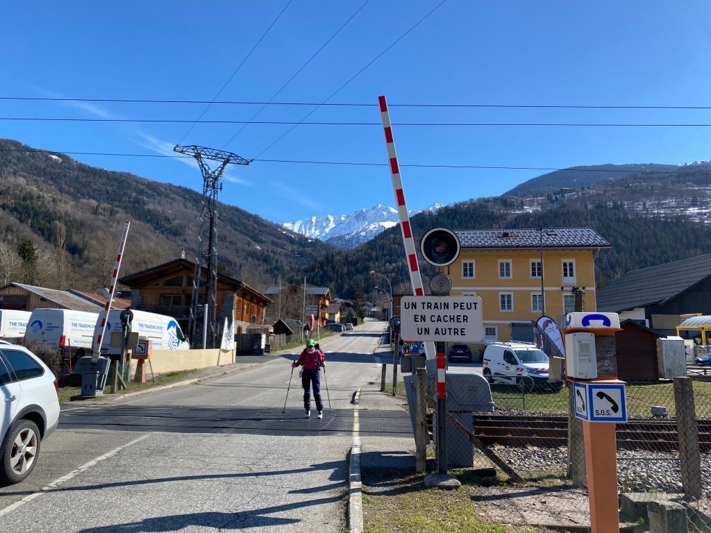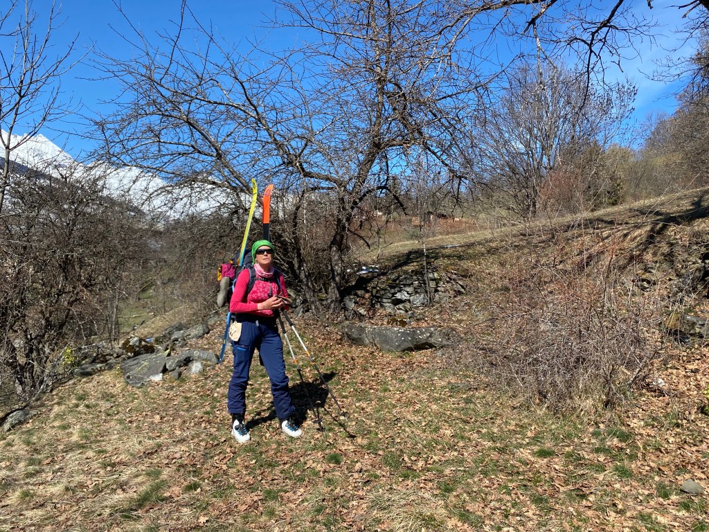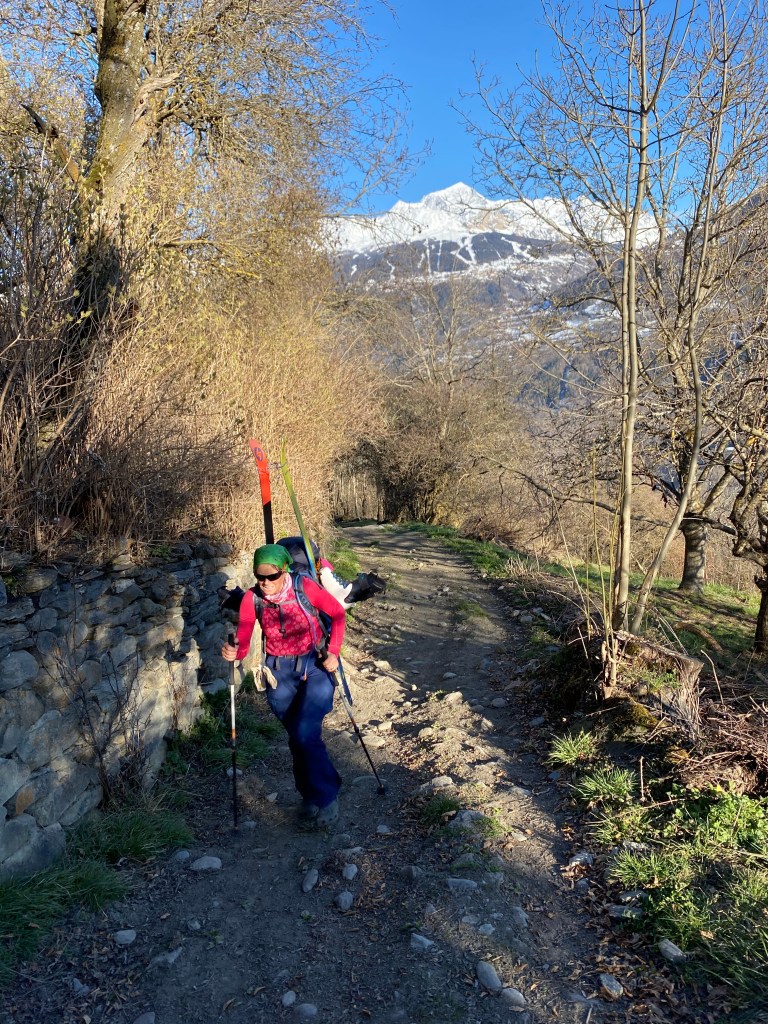 Étape de traversée de la Tarentaise. En partant nous ne savons pas si nous allons marcher en chaussure de ski, skier ou marcher en Crocs. Finalement ce sera un peu des trois Nous commençons par descendre à ski jusqu’au hameau des Mouilles à l’entrée de Peisey Longue pause shopping dans les magasins de Peisey , nous renvoyons également le matériel technique dont nous n’aurons plus besoin chez nousDescente très bucolique sur le GR5 en rejoignant le hameau de MartoreyPause picnic ***** près de Martorey sur une énorme pierre à meuler abandonnée au bord du chemin et qui nous sert de table Traversée de Landry charmante par le village avant de retrouver la route du chalet des sœurs que nous connaissons bienChangement technique de matériel … mollets à l’air et en Crocs pour la remontée à ValezanLa fontaine très bienvenue du hameau du Crey avec son habitante au balcon qui nous pose mille questions . Étonnant à quel point ce site semble isolé pourtant si près de la nationale Remontée sur la superbe section du GR5 entre Le Crey et Valezan avec le Mont Pourri derrière nous Arrivée à Valezan et ses maisons à auvent géant par un temps superbe Nous allons rendre visite à Nadette que Claire et Delphine connaissent bien et parlons beaucoup de sa fille Brigitte